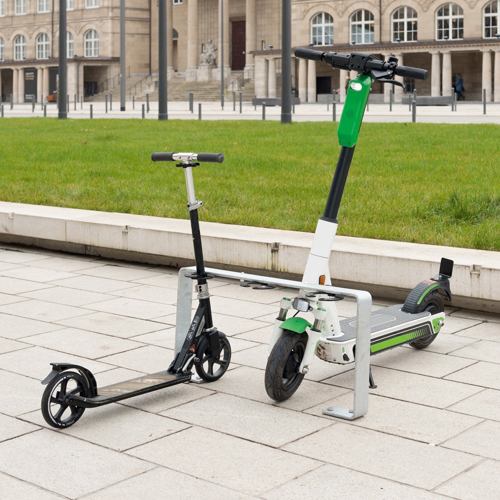 Einzeln nebeneinander nutzbar, oderauch für zweiseitiges Parken der Scooter. Frei einstellbar.