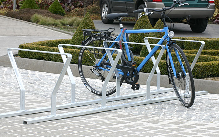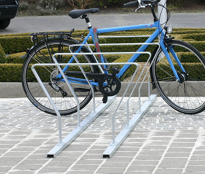 Fahrradständer-Reihenparker mit aufschraubbaren Anlehnbügeln aus 60 mm Flachstahl. Komplett aus feuerverzinktem Stahl, als ein- oder zweiseitige Anlage nutzbar. Die Bodenschienen sind aus gekantetem Stahlblech, vorgebohrte Löcher für die Bodenmontage.