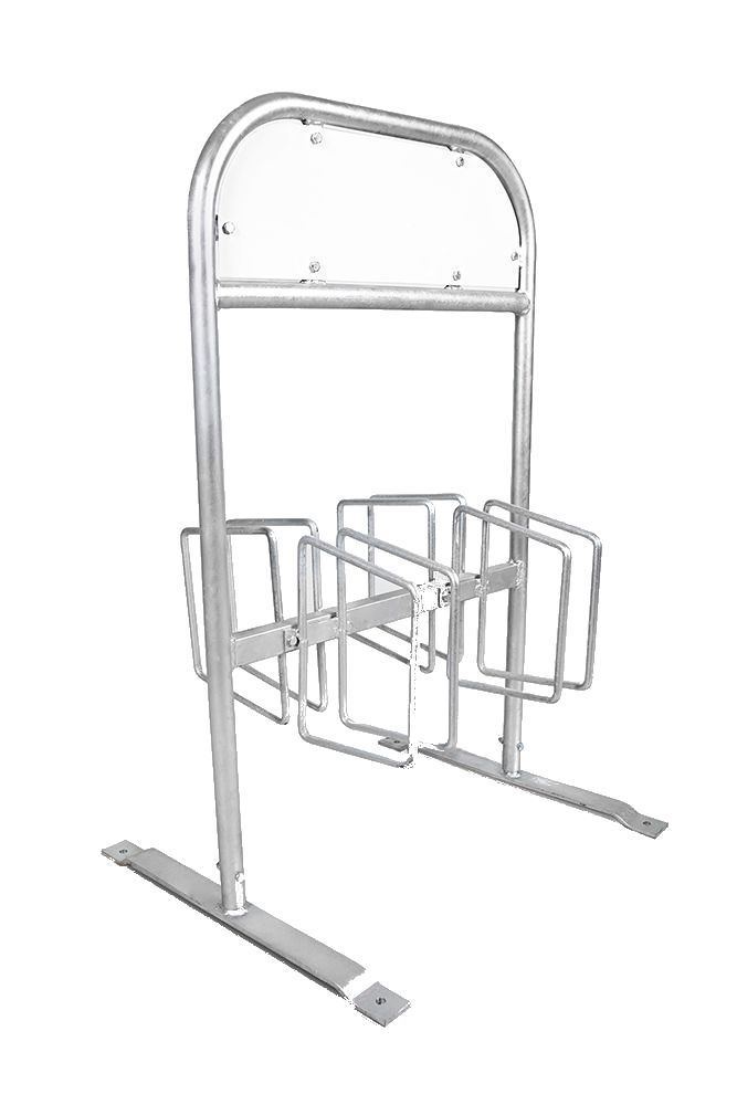 Fahrradständer mit Werbeschild aus Aluminium. Für das Einstellen von vier oder sechs Fahrrädern geeignet und als farbige Ausführung in verschiedenen RAL-Tönen erhältlich.
